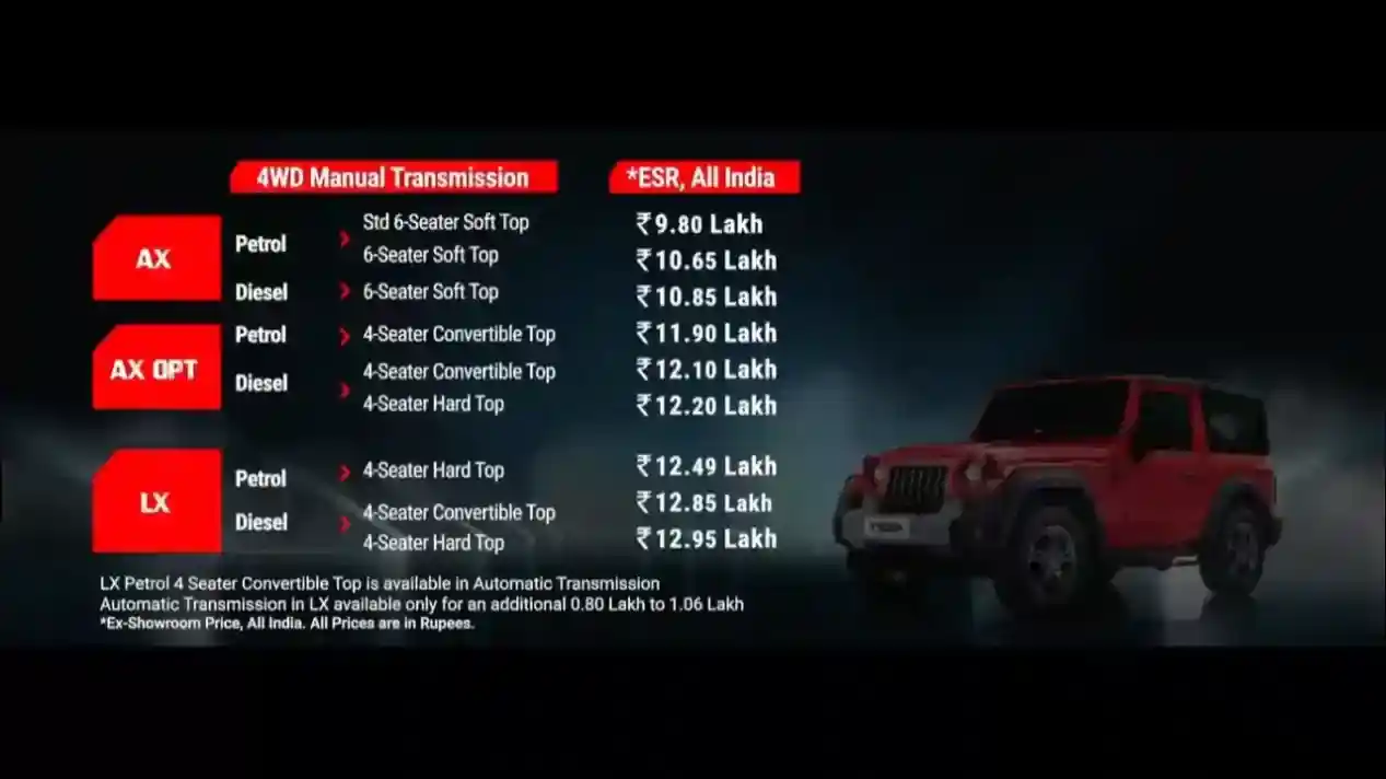 Mahindra Thar for the first time will offer petrol engine alongwith a mHawk diesel engine.