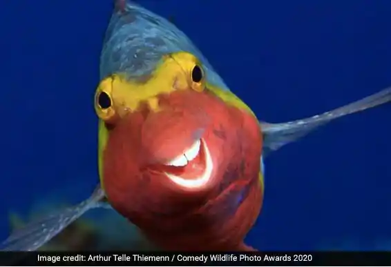 The finalists of this year's Comedy Wildlife Photography Awards have been announced, each one showing the power of anthropomorphism.The finalists for this year's Comedy Wildlife Photography Awards have been announced - and they are guaranteed to brighten up your day. The top 44 images for 2020 include a fox negotiating with a mouse, a grinning fish, a photo-bombing giraffe and a grumpy sea turtle, among others. Entries for this year's edition of Comedy Wildlife Photography Awards feature animals from across the globe - from the lions of Kalahari Desert to the snow monkeys of Japan. Five of the images from this year's finalists were taken in India. There are following- Tough negotiations by Ayala Fishaimer. A fox in Israel