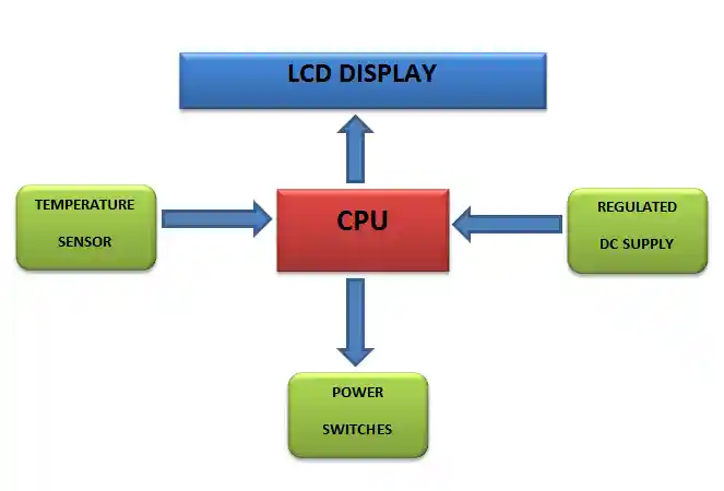 Microcontroller is programmed in such a way that it controls the switches according to the ambient temperature. When temperature is very high, then AC is power ON. At moderate temperature, fan is power ON. At room temperature, nothing is power ON. And when temperature is very low, heater is power ON