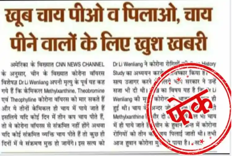 According to the viral post, it is said that according to the famous US CNN news channel, China's famous corona virus expert Dr. Li Wenliang has stated before his death that the chemical Methylxanthine, Theobromine and Theophyline can kill the corona virus. And all three are found in chemical tea. In such a situation, if one drinks three cups of tea a day, then they will not be infected with the corona virus.